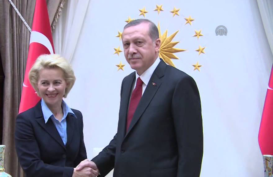 Archievbild: Von der Leyen, repräsentiert durch die Türkische Flagge, trifft Erdogan.