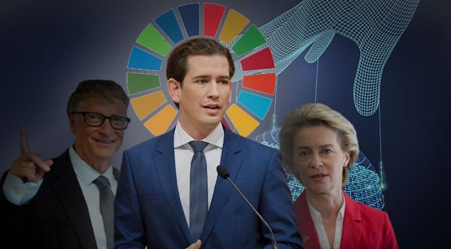 Sebastian Kurz: Bild: Parlamentsdirektion / Zinner; Agenda2030-Kreis: paolo.marraffa, Wikimedia Commons, CC BY-SA 4.0; Von der Leyen/Flickr, US Secretary of Defense, CC BY 2.0; Gates: CC0; Komposition: Wochenblick / Eigenes Werk