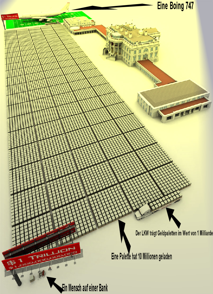 Zum Vergleich: Dies sind eine Billion = 1.000 Milliarden Euro in 100 Euroscheinen. Zu sehen sind Doppelpaletten voll 100 Euro Scheine. Jeder EU-Einwohner bezahlt dafür 2.000€.