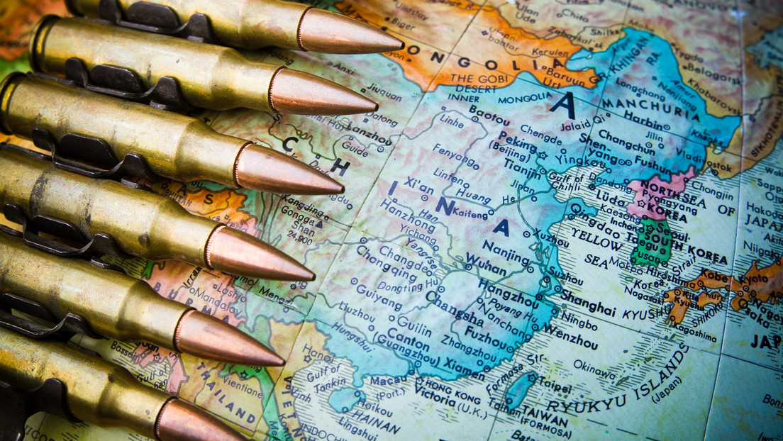 Eine Karte mit China im Fokus und Maschinengewehrmunition (Symbolbild) Bild: Gettyimages.ru / halbergman