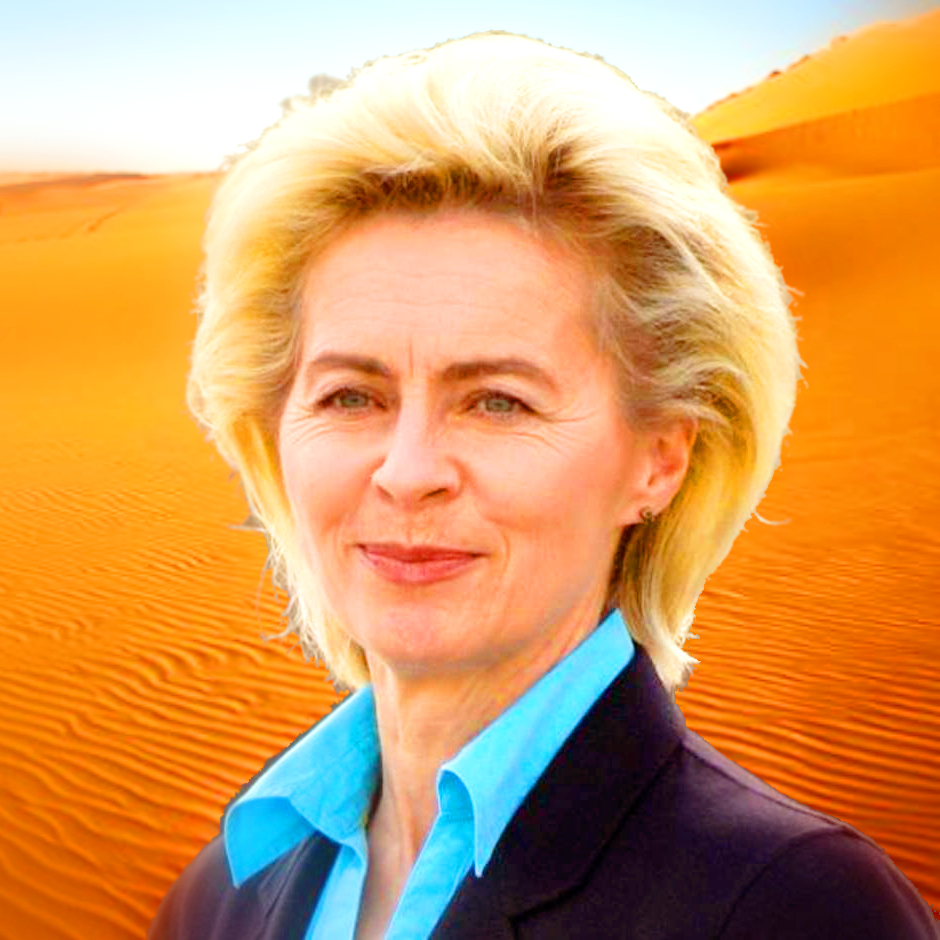 Ursula von der Leyen (2019) vor einer möglicherweise zukünftigen CO2-freien EU-Landschaft (Symbolbild)