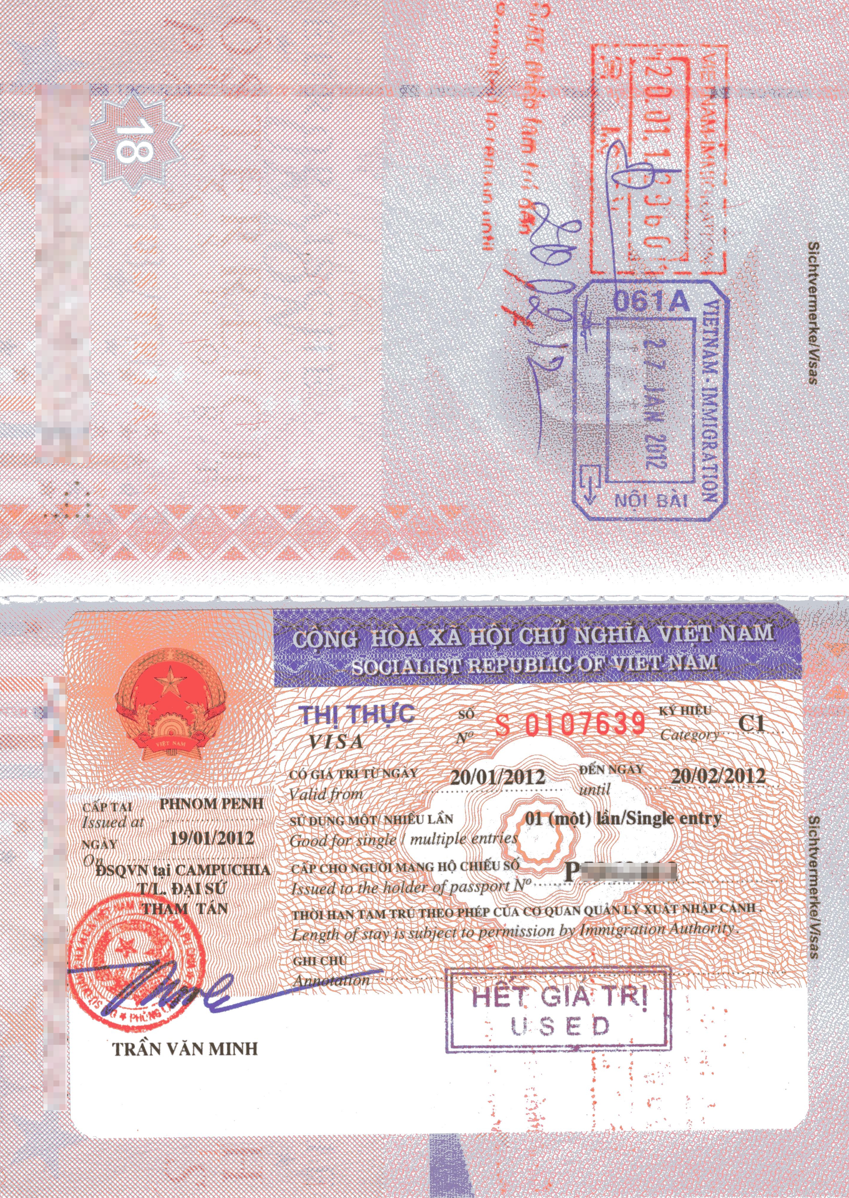 Vietnamesisches Visum, Ein- und Ausreisestempel in einem Österreichischen Pass, 2012