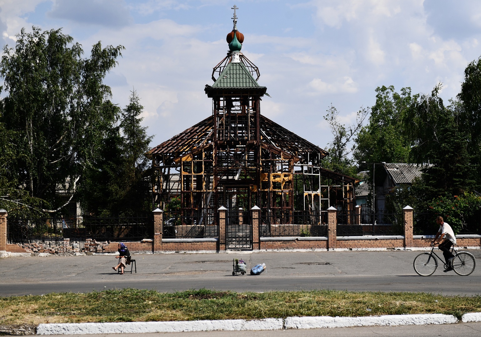 Auf dem Bild: Eine abgebrannte Kirche in der Stadt Wolnowacha, 5. Juli 2022. Bild: PAWEL LISSIZYN / Sputnik