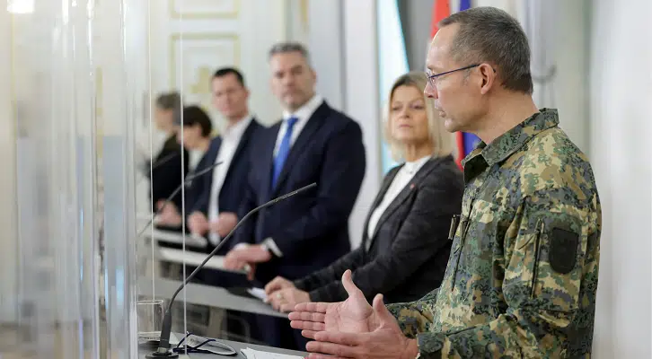 Am 18. Dezember 2021 fand eine Pressekonferenz zum Thema Vorstellung „Gesamtstaatliche COVID-Krisenkoordination“ (GECKO) statt. Im Bild Bundeskanzler Karl Nehammer (m.), Bundesminister Wolfgang Mückstein (2.v.l.), Bundesministerin Klaudia Tanner (2.v.r.), Chief Medical Officer Katharina Reich (l.) und Generalmajor Rudolf Striedinger (r.).