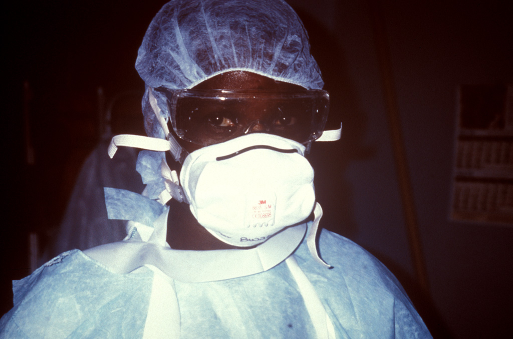 Krankenschwester mit persönlicher Schutzausrüstung vor Betreten einer Isolierstation; Ebolafieber-Epidemie 1995 in DR Kongo (ehemals Zaire)