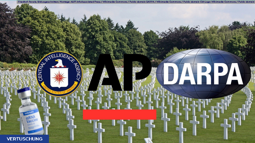 Bild: Auf1-Logo Friedhof: Pexels; Bild zugeschnitten; Montage: AUF1.InfoAssociated Press / Wikimedia Commons / Public domain DARPA / Wikimedia Commons / Public domain CIA-Logo: Wikimedia Commons / Public domain / Eigenes werk