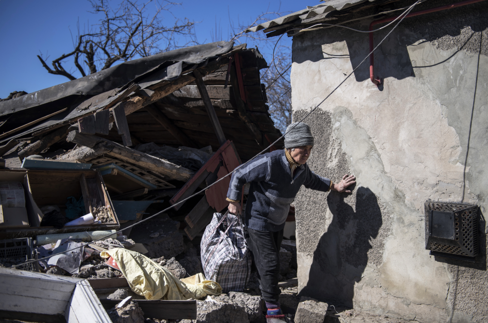 Frau transportiert Habe aus den Ruinen ihres von ukrainischen Streitkräften zerschossenen Hauses. Brjanka, Volksrepublik Lugansk, 22ster März 2022