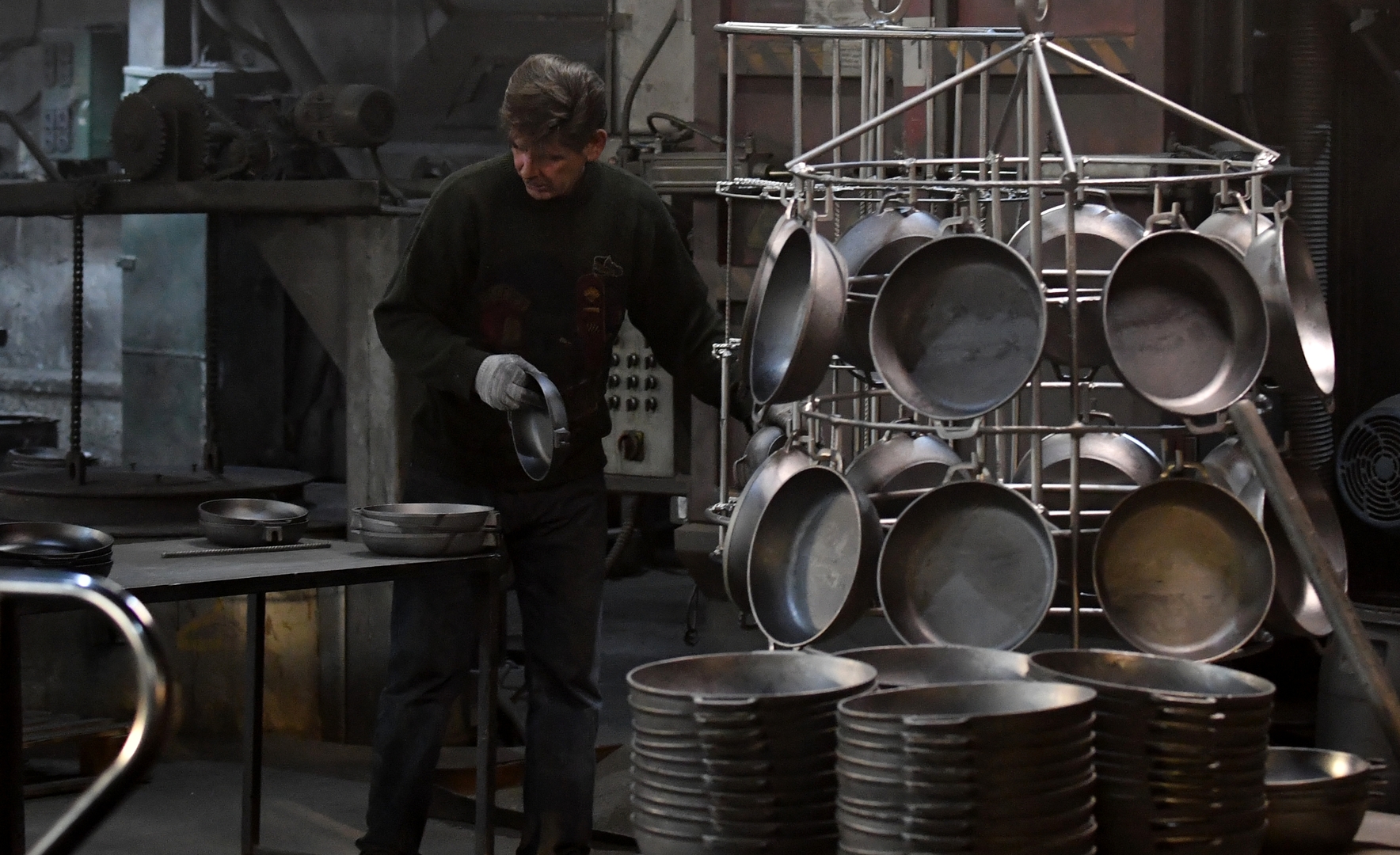 Archivbild: Ein Mitarbeiter in einer Produktionshalle des Geschirrhertellers BIOL in Melitopol, 1. November 2022. Bild: Sputnik