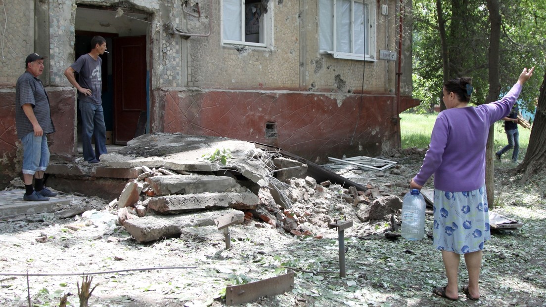 Archivbild: Bewohner im Hof eines durch Beschuss ukrainischer Streitkräfte beschädigten Wohngebäudes in der Siedlung Gorlowka in der Donezker Volksrepublik Bild: Sergei Awerin / Sputnik