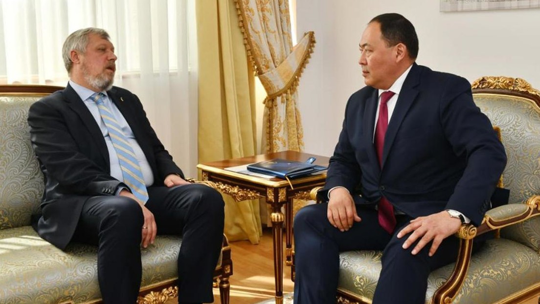 Der ukrainische Botschafter Petro Wrublewski (links) bei einem Gespräch im kasachischen Außenministerium Bild: gov.kz / RT