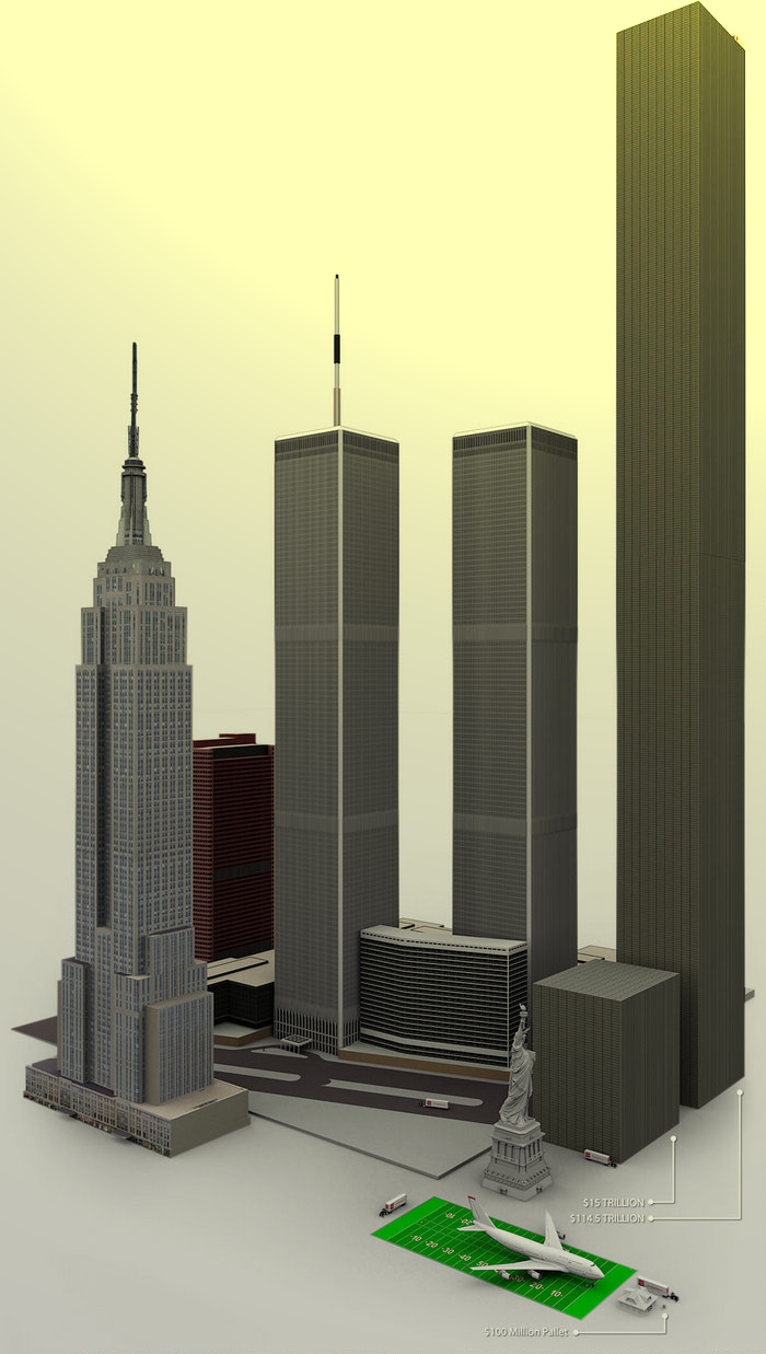 Größenvergleich: Auf dem Bild sind Gebäude in Originalgröße zu sehen die aus 114,5 Billionen Euro bestehen, die aus 100 Euro Scheinen gebaut wurden (Symbolbild)