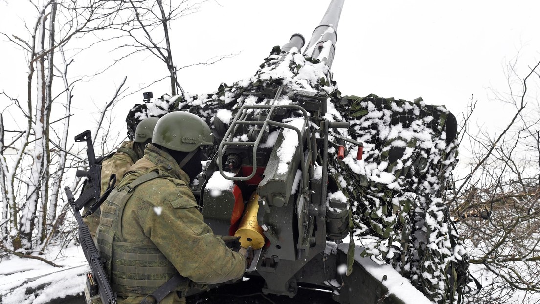 Russische Artilleristen beladen eine Haubitze vom Typ Msta-B im südlichen Einsatzgebiet der Sonderoperation, 1. Februar 2023. Bild: Sputnik