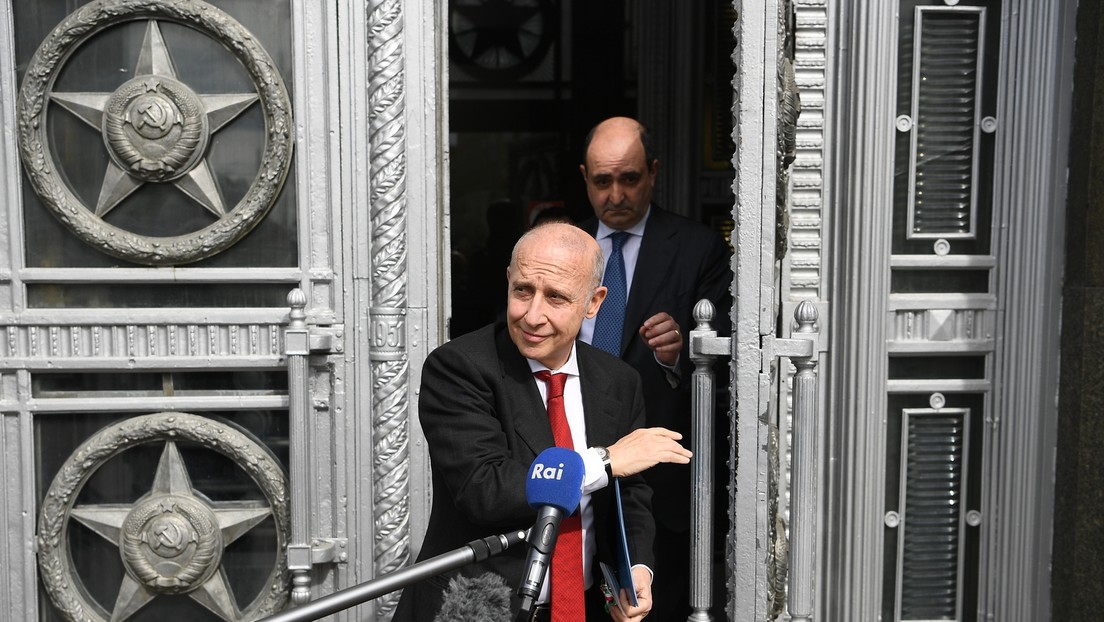 Der italienische Botschafter in Moskau verlässt nach Entgegennahme der Note über die Ausweisung seiner Diplomaten das Gebäude des russischen Außenministeriums am 18. Mai 2022.