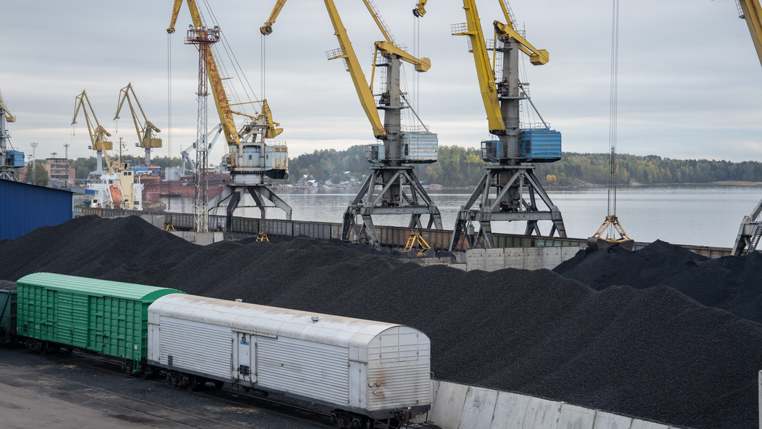 Verladung von Streinkohle in Güterwaggons mithilfe von Kranschaufeln im Hafen von Wyborg. Bild: Gettyimages.ru / Dmitry Marchenko / EyeEm