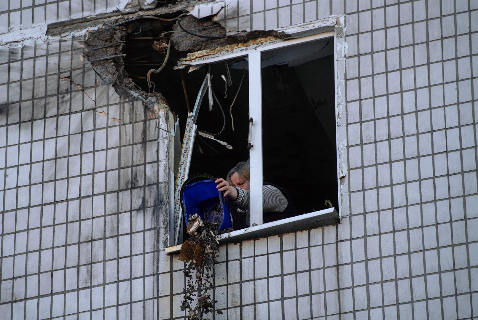 Eine Einwohnerin von Donezk räumt am 9. Januar 2023 ihre Wohnung auf, nachdem diese bei einem Angriff durch ukrainische Streitkräfte beschädigt worden ist. Bild: WALERI MELNIKOW / Sputnik
