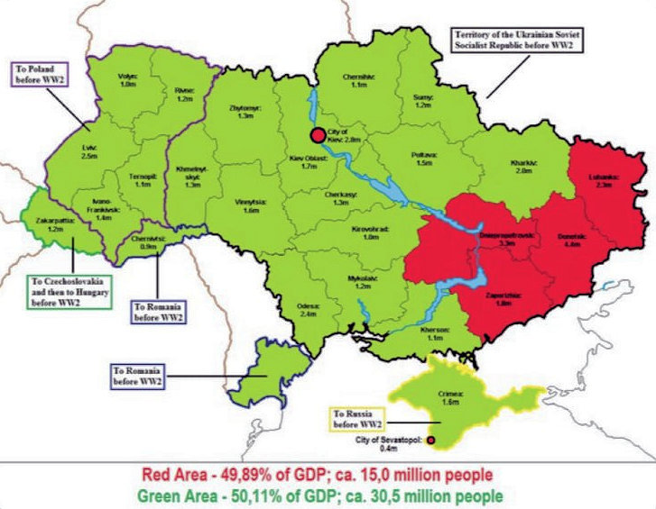 Der rote Bereich, also der Donbass und angrenzende Regionen machen rund 50% des BIP der Ukraine aus. Nimmt man noch Kherson, Mykolaiv, Odessa, Kharkiv dazu, entspricht das 75% des BIP. Die Ukraine wäre so nicht lebensfähig.