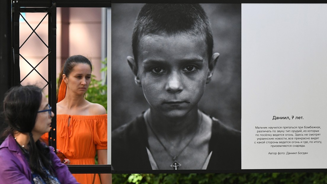 "Schau dem Donbass in die Augen" ist der Titel einer Fotoausstellung, die in russischen Städten gezeigt wird. Bild: Sputnik / Ilya Naymushin