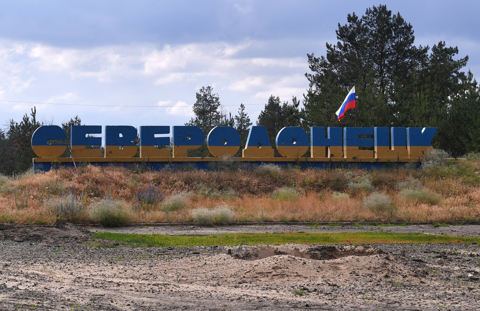 Symbolbild: Stele an der Einfahrt nach Sewerodonezk mit dem Namen der Stadt. Bild: Wiktor Antonjuk / Sputnik