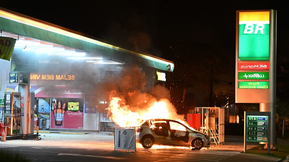 Ein Auto brennt an einer Tankstelle infolge von Prostesten in Brasília, 12. Dezember 2022.