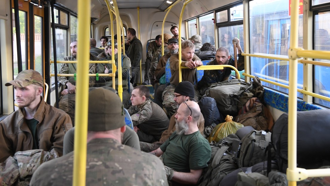 17. April 2022: Ukrainische Soldaten sitzen in einem Bus, nachdem sie das Gelände des Stahlwerks Asow-Stahl in Mariupol verlassen haben