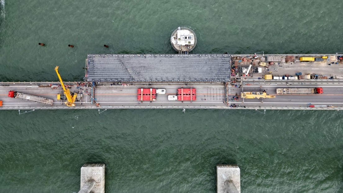 Luftbild von der Reparatur der Krim-Brücke: Einen Monat nach dem Anschlag ist das erste Fahrbahn-Segment ausgetauscht, 8. November 2022
