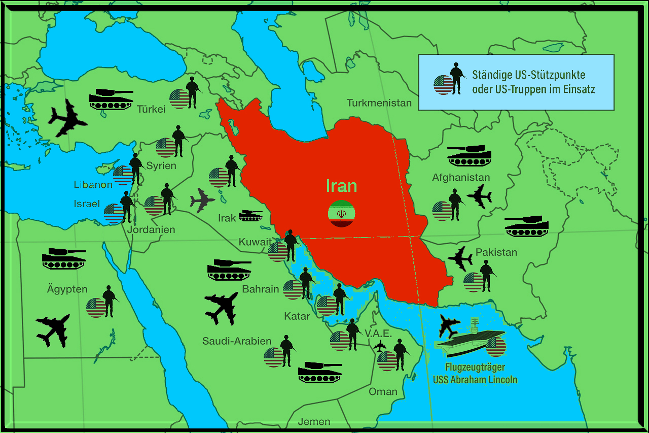 US-Militärbasen und Truppen um den Iran herum. Iran ist neben Nordkorea eines der letzten Länder ohne eine Rothschild-Zentralbank.