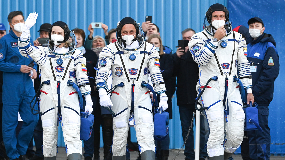 Schauspielerin Julia Peressild, Kosmonaut Anton Schkaplerow und Regisseur Klim Schipenko vor dem Start des Raumschiffs "Sojus MS-19" am 5. Oktober 2021.