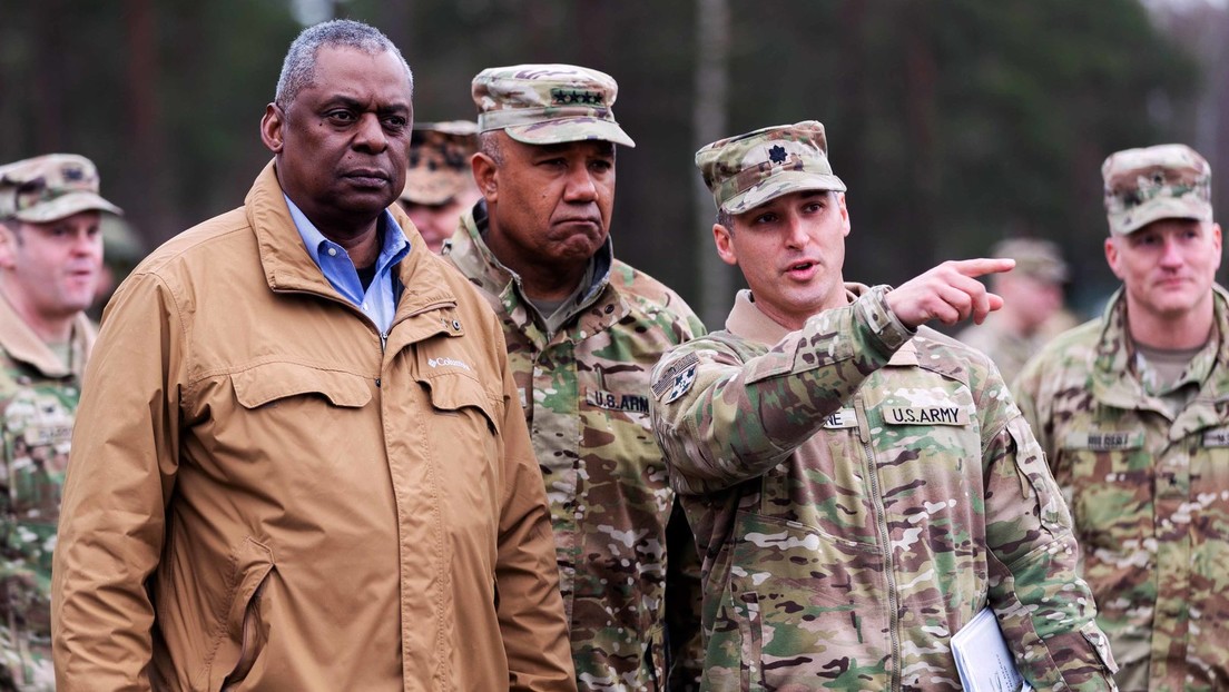 US-Verteidigungsminister Lloyd Austin trifft sich am 17. Februar 2023 im deutschen Grafenwöhr mit US-Ausbildern der ukrainischen Soldaten. (2023) Bild: www.lgoballookpress.com