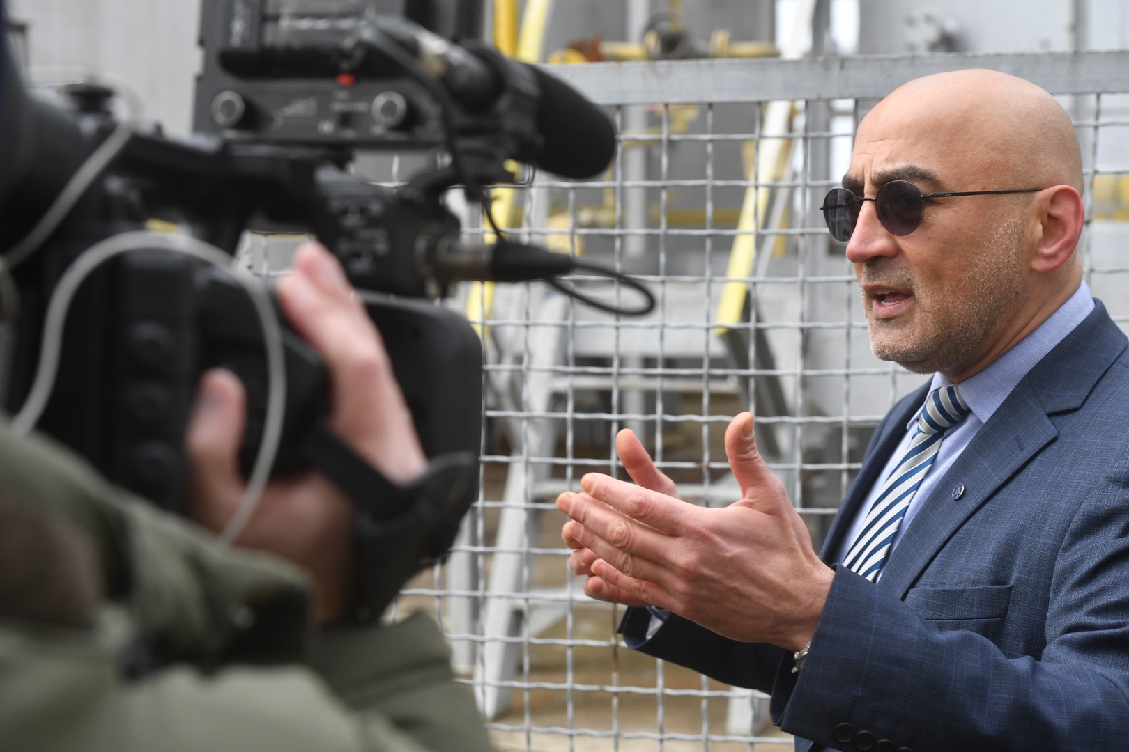 Rosenergoatom-Berater Renat Kartschaa spricht vor Journalisten auf dem Gelände des AKW Saporoschje, 6. März 2023. Bild: Sputnik