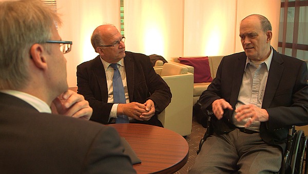 ZDF- Autor Elmar Theveßen im Gespräch mit Peter Schaar, ehemaliger Bundesdatenschutz-beauftragter (Mitte), und William Binney, ehemaliger NSA Mitarbeiter und Whistleblower. Bild: ZDF und Zeljko Pehar