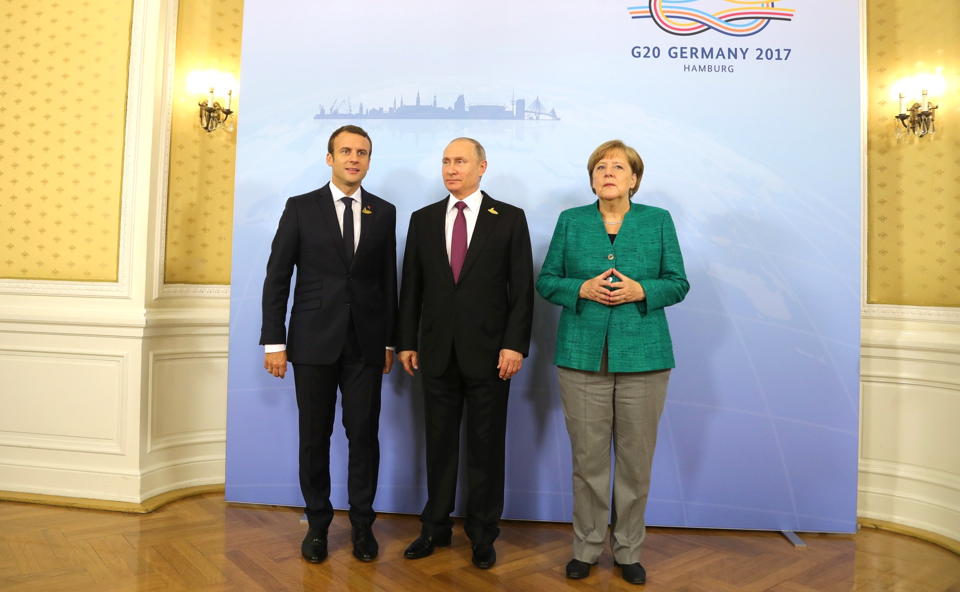 Emmanuel Macron, Vladimir Putin und Angela Merkel (2017)