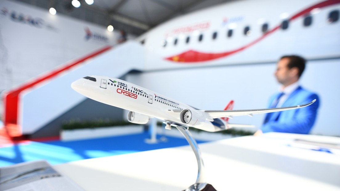 Symbolbild: Ein Modell des russisch-chinesischen Großraumflugzeugs CR929 auf der Internationalen Luft- und Raumfahrtausstellung MAKS 2019.