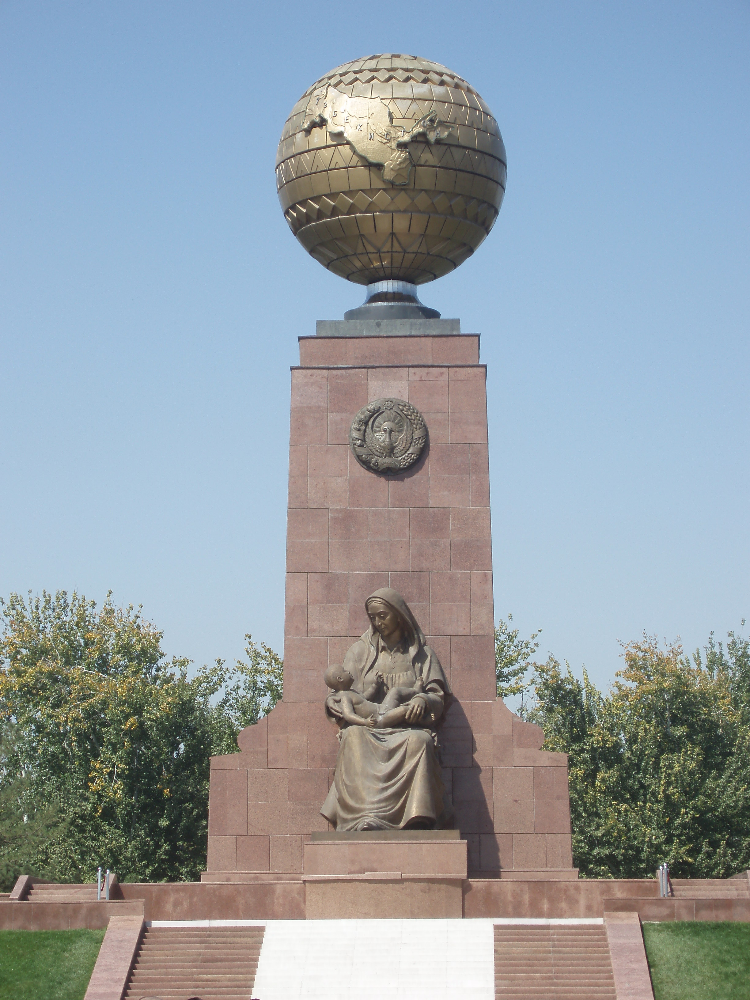 Unabhängigkeitsdenkmal des Mutterlandes Taschkent: Usbekistans Umriss erscheint auf dem Globus; die glückliche Mutter, Symbol für das Mutterland, kümmert sich um die Zukunft, das Kind