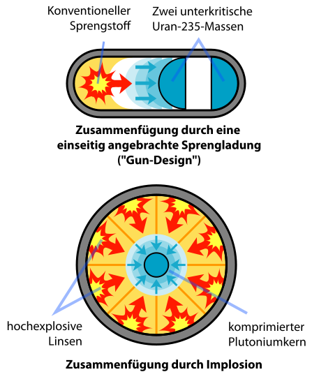 Zünder von massenmörderischen Kernwaffen: Die zwei Methoden der Zusammenfügung unterkritischer Massen: Gun-Design und Implosion