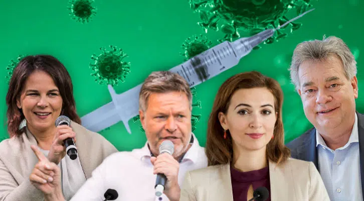Bild: Hintergrund/Spritze: Freepik (2); Baerbock & Habeck: beide Raimond Spekking, Wikimedia Commons, CC BY-SA 4.0; Zadic: Die Grünen/Karo Pernegger, Wikimedia Commons, CC0; Kogler: P.Lechner/BMKÖS, Wikimedia Commons, CC BY-SA 2.0; Collage: Wochenblick / Eigenes Werk