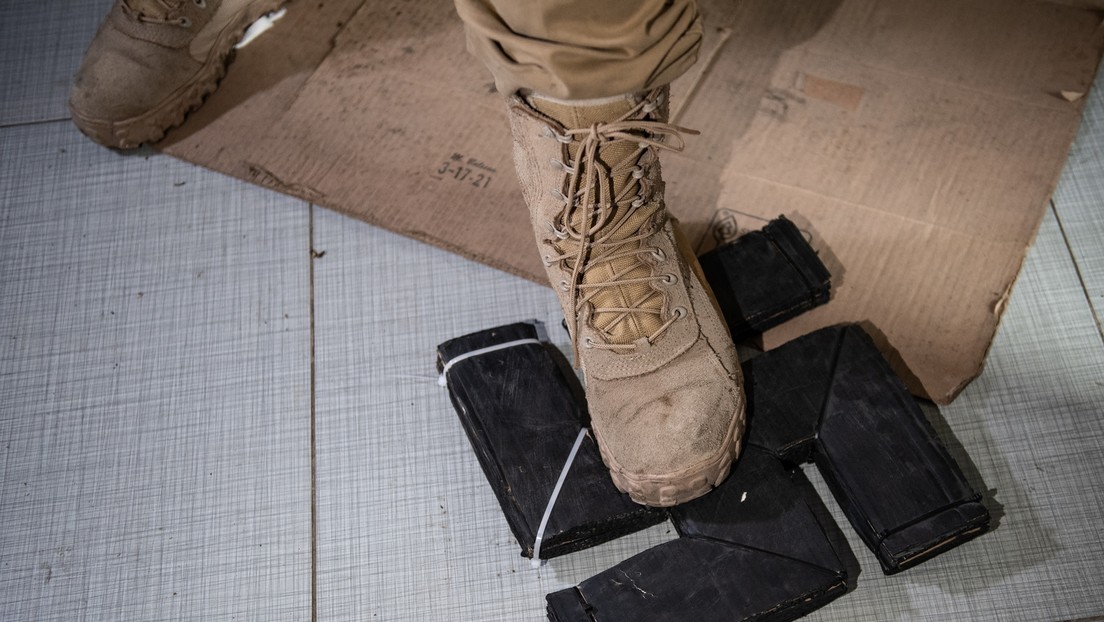 Ein russischer Soldat in einem von ukrainischen Betrügern verlassenen Callcenter in Berdjansk. Unter dem Fuß des Soldaten: ein Hakenkreuz (Archivbild)