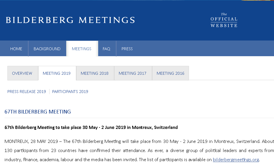 Zurück zu 67. Bilderberg Treffen findet vom 30. Mai bis 2. Juni 2019 in Montreux, Schweiz, statt