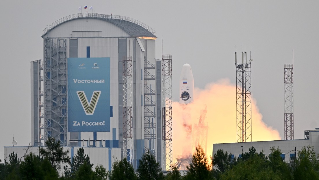 Im Zeichen von "V" und "Z", aber kurz vor dem Zusammenbruch? – Eine Sojus-2.1b-Trägerrakete mit Fregat-Endstufe und dem Mondlandegerät Luna-25 hebt von der Startrampe des Kosmodroms Wostotschny in der russischen Region Amur ab, 11. August 2023 Bild: Sputnik / Grigory Sysoev/Sputnik