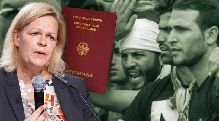 Bild: Migranten: OEFJ; Deutscher Pass: Alexander Johmann, Flickr, CC BY-SA 2.0; Faeser: Steffen Prößdorf, CC BY-SA 4.0, via Wikimedia Commons; Komposition: Wochenblick / Eigenes Werk