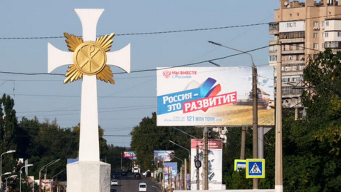 Straßenszene mit Plakat "Wir sind zusammen mit Russland" (Screenshot) Bild: Сергей Мальгавко/ТАСС / https://tass.ru/mezhdunarodnaya-panorama/15688775 / RT