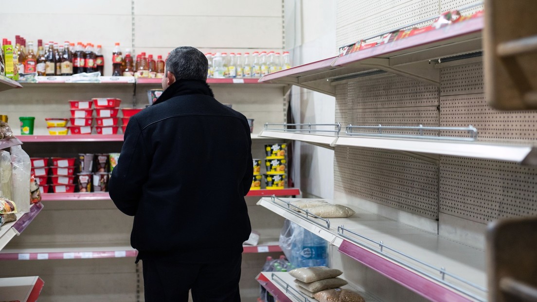 Auf dem Archivbild: Ein Mann steht vor fast leeren Lebensmittelregalen in einem Geschäft in Stepanakert im Bergkarabach, 28. Dezember 2022. Bild: Sputnik / DAWID KAGRAMANJAN
