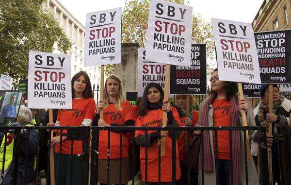 Dutzende Demonstranten haben anlässlich des indonesischen Staatsbesuches in London vor der Residenz des britischen Premierministers protestiert. Bild: Survival