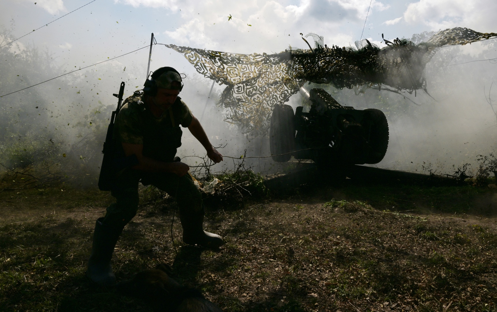 Archivbild: Ein russischer Armeeangehöriger schießt mit einer Haubitze vom Typ D-30 auf ukrainische Stellungen in der Volksrepublik Lugansk, 1. Juli 2023. Bild: JEWGENI BIJATOW / Sputnik