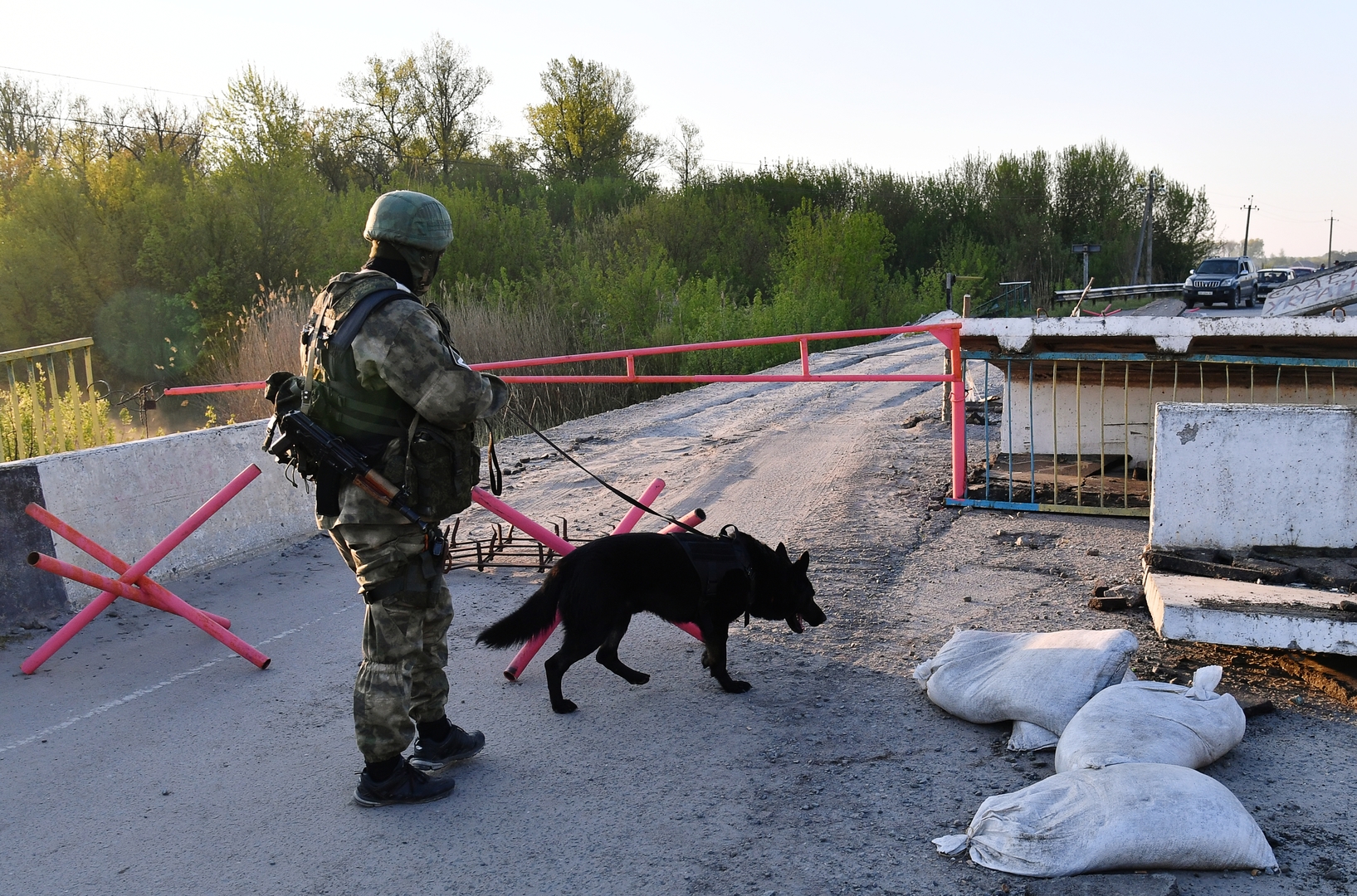 Ein Soldat des Innenministeriums der LVR überprüft mit einem Diensthund einen Kontrollpunkt im Gebiet Charkow auf Sprengstoff und Minen. Bild: Wiktor Antonjuk / Sputnik