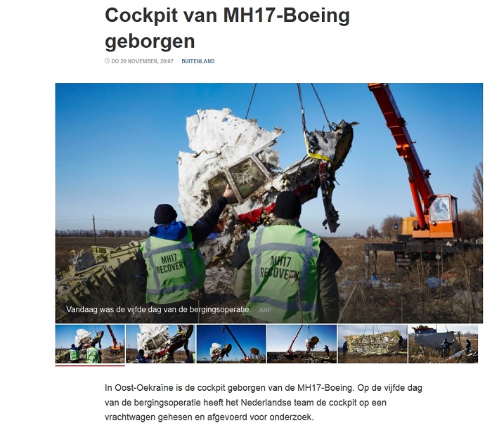 Der rechte Cockpitteil. Man kann an der Oberseite über den Fenstern mehrere parallele Einschläge sehen. Diese können nur von einer Doppellauf Bordkanone eines Kampffliegers stammen. Es ist völlig unmöglich, dass die unspezifisch ausgerichteten Einschläge von Shrapnellmunition einer BUKM1 Luftabwehrrakete eine solche exakte Parallelität hervorbringen. Ausserdem kann man mehrere runde Löcher in den Fensterscheiben oder in Fensternähe erkennen. Bild: Screenshot http://nos.nl/artikel/2004822-cockpit-van-mh17-boeing-geborgen.html
