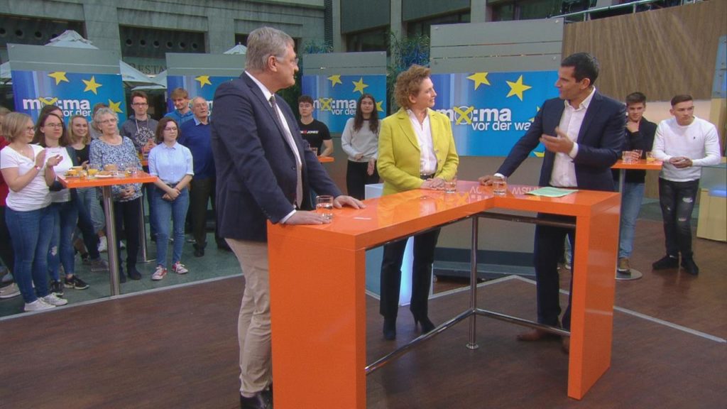 Prof. Dr. Jörg Meuthen im Gespräch mit Nicola Beer (FDP) und Moderator Mitri Sirin vom ZDF-Morgenmagazin am 8.5.2019