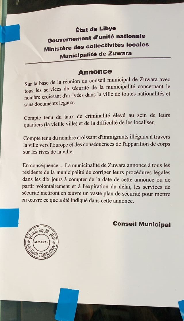 Dieses Dokument wurde an den Fassaden von Gebäuden angebracht, die von subsaharischen Migranten in Zouara frequentiert werden Bild: FDS/UM/Eigenes Werk