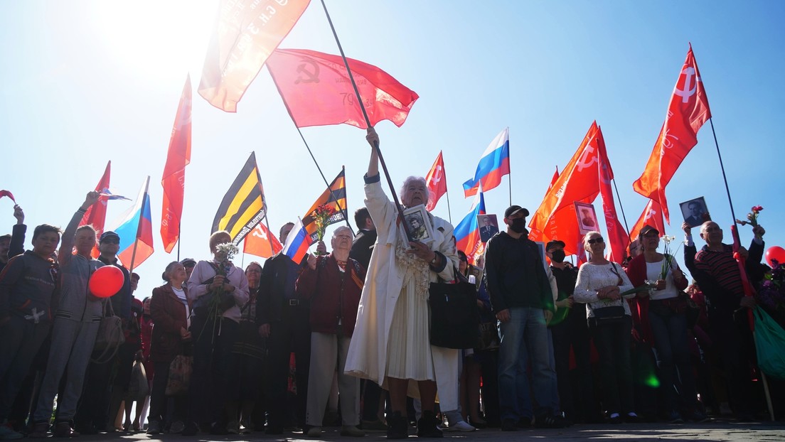 Auf dem Bild: Teilnehmer der Aktion "Unsterbliches Regiment" marschieren am 9. Mai 2022 durch Cherson.