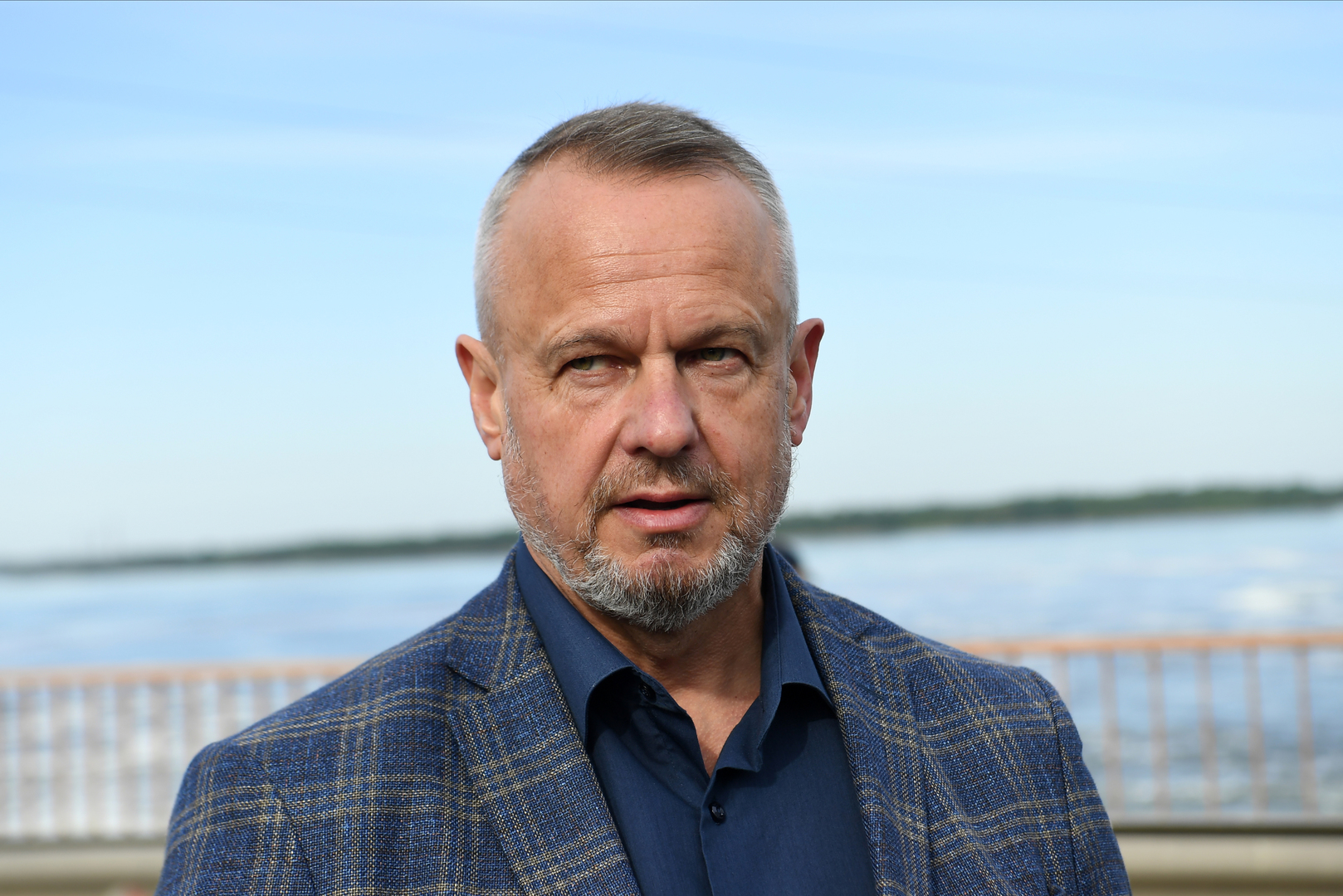 Der Leiter der militärisch-zivilen Verwaltung des Kachowski-Bezirks des Gebiets Cherson, Wladimir Leontjew, spricht mit Reportern am Wasserkraftwerk Kachowka (Archivbild)