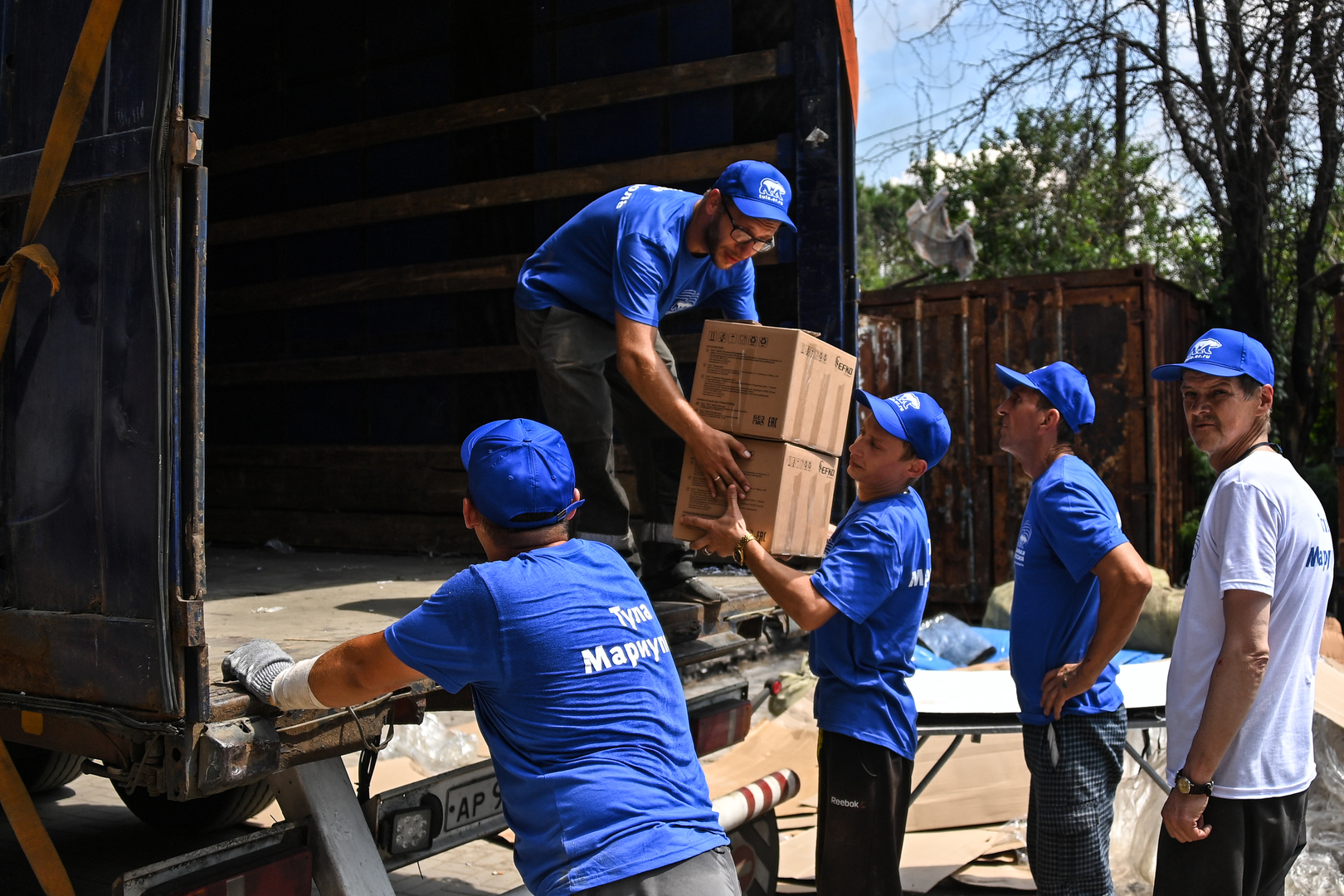 Archivbild: Arbeiter beim Entladen der humanitären Hilfe für die Bewohner der Stadt Mariupol. Bild: Sputnik